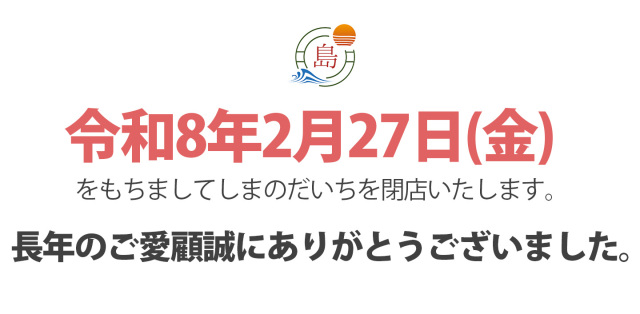 これまで長きにわたりしまのだいちをご愛顧賜り、本当にありがとうございました。 当店をご愛顧賜わりましたお客様に深く感謝申し上げます。
